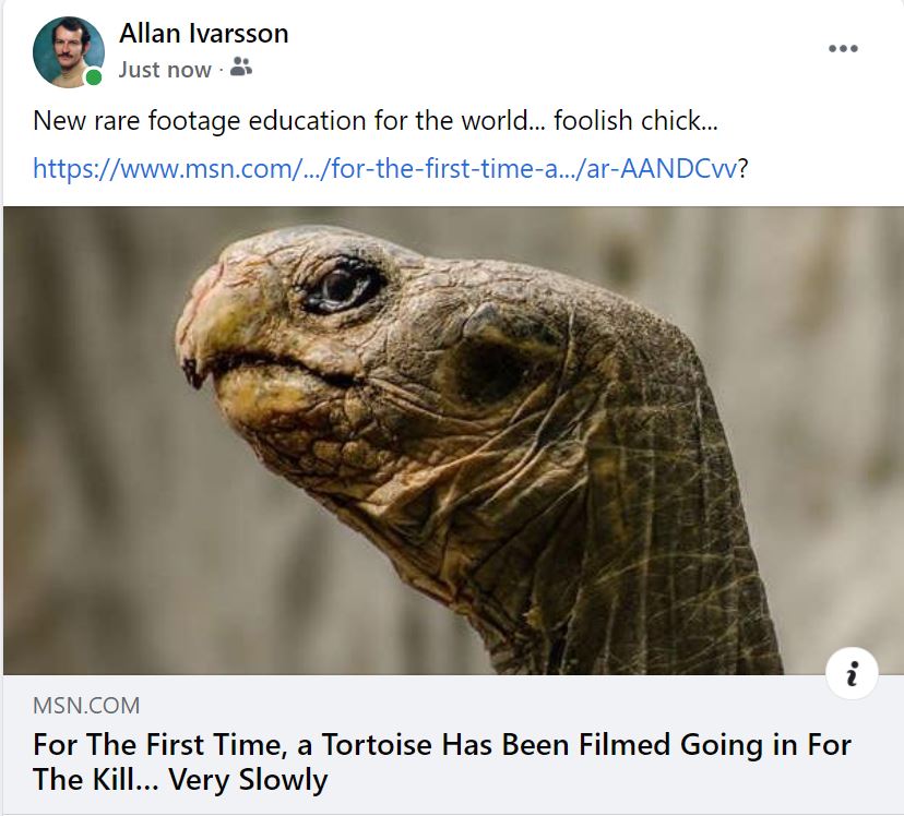 Nature: Foolish Chick allanivarsson 5 years ago https://www.msn.com/en-au/news/techandscience/for-the-first-time-a-tortoise-has-been-filmed-going-in-for-the-kill-very-slowly/ar-AANDCvv? Share this: Share on X (Opens in new window) X Share on Facebook (Opens in new window) Facebook More Print (Opens in new window) Print Share on LinkedIn (Opens in new window) LinkedIn Share on Tumblr (Opens in new window) Tumblr Share on Pinterest (Opens in new window) Pinterest Email a link to a friend (Opens in new window) Email